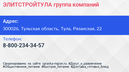 ЭЛИТСТРОЙТУЛА, группа компаний по адресу 300026, Тульская область, Тула, Рязанская, 22 в дальнейшем Организация, размещена в следующих категориях: