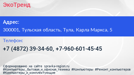 ЭкоТренд по адресу 300001, Тульская область, Тула, Карла Маркса, 5 в дальнейшем Организация, размещена в следующих категориях:
