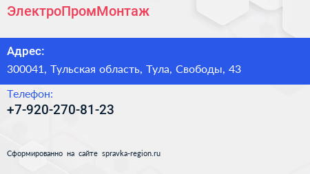 ЭлектроПромМонтаж по адресу 300041, Тульская область, Тула, Свободы, 43 в дальнейшем Организация, размещена в следующих категориях: