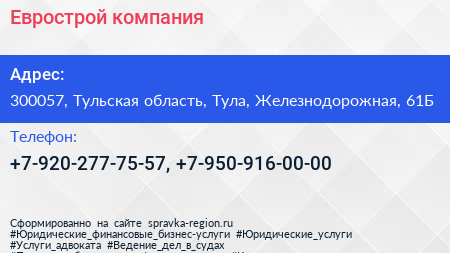 Еврострой, компания по адресу 300057, Тульская область, Тула, Железнодорожная, 61Б в дальнейшем Организация, размещена в следующих категориях: