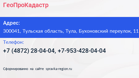 ГеоПроКадастр по адресу 300041, Тульская область, Тула, Бухоновский переулок, 11 в дальнейшем Организация, размещена в следующих категориях: