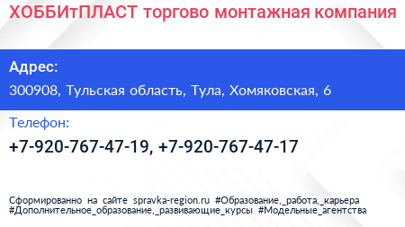 ХОББИтПЛАСТ, торгово-монтажная компания по адресу 300908, Тульская область, Тула, Хомяковская, 6 в дальнейшем Организация, размещена в следующих категориях: