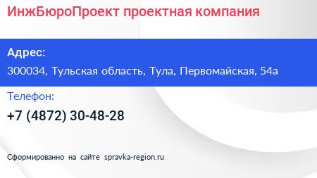 ИнжБюроПроект, проектная компания по адресу 300034, Тульская область, Тула, Первомайская, 54а в дальнейшем Организация, размещена в следующих категориях: