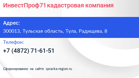 ИнвестПроф71, кадастровая компания по адресу 300013, Тульская область, Тула, Радищева, 8 в дальнейшем Организация, размещена в следующих категориях: