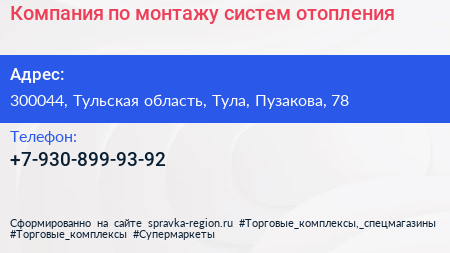 Компания по монтажу систем отопления по адресу 300044, Тульская область, Тула, Пузакова, 78 в дальнейшем Организация, размещена в следующих категориях: