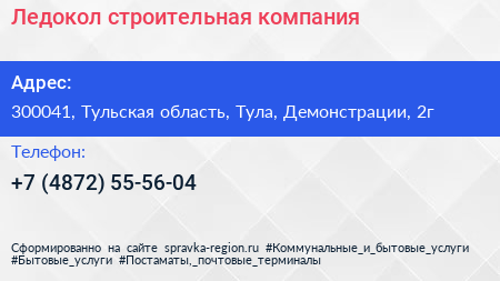 Ледокол, строительная компания по адресу 300041, Тульская область, Тула, Демонстрации, 2г в дальнейшем Организация, размещена в следующих категориях: