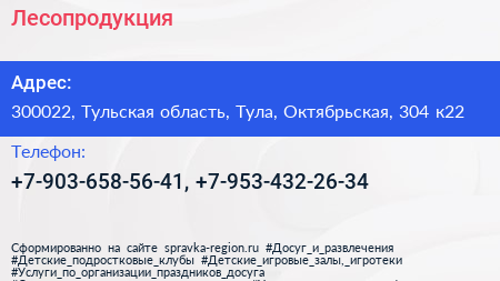 Лесопродукция по адресу 300022, Тульская область, Тула, Октябрьская, 304 к22 в дальнейшем Организация, размещена в следующих категориях: