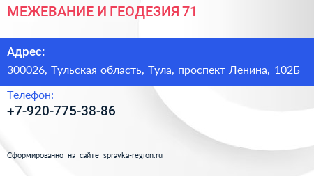 МЕЖЕВАНИЕ И ГЕОДЕЗИЯ 71 по адресу 300026, Тульская область, Тула, проспект Ленина, 102Б в дальнейшем Организация, размещена в следующих категориях: