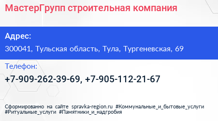 МастерГрупп, строительная компания по адресу 300041, Тульская область, Тула, Тургеневская, 69 в дальнейшем Организация, размещена в следующих категориях: