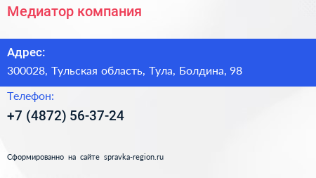 Медиатор, компания по адресу 300028, Тульская область, Тула, Болдина, 98 в дальнейшем Организация, размещена в следующих категориях: