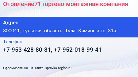 Отопление71, торгово-монтажная компания по адресу 300041, Тульская область, Тула, Каминского, 31а в дальнейшем Организация, размещена в следующих категориях: