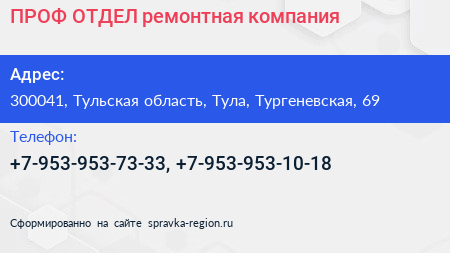 ПРОФ-ОТДЕЛ, ремонтная компания по адресу 300041, Тульская область, Тула, Тургеневская, 69 в дальнейшем Организация, размещена в следующих категориях: