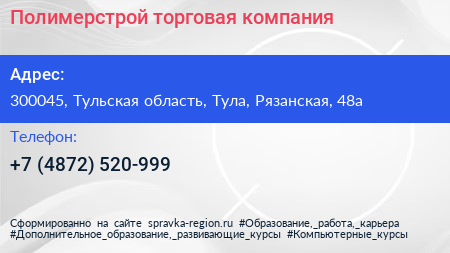 Полимерстрой, торговая компания по адресу 300045, Тульская область, Тула, Рязанская, 48а в дальнейшем Организация, размещена в следующих категориях:
