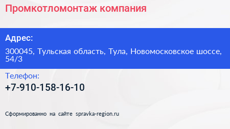 Промкотломонтаж, компания по адресу 300045, Тульская область, Тула, Новомосковское шоссе, 54/3 в дальнейшем Организация, размещена в следующих категориях: