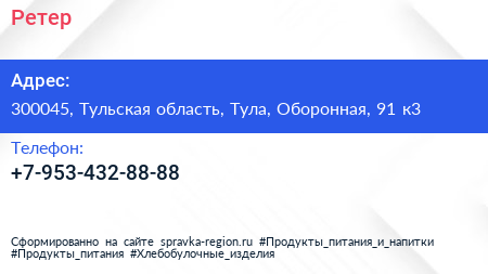 Ретер по адресу 300045, Тульская область, Тула, Оборонная, 91 к3 в дальнейшем Организация, размещена в следующих категориях:
