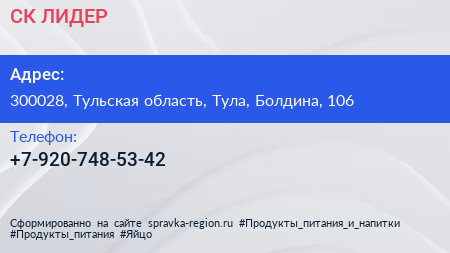 СК ЛИДЕР по адресу 300028, Тульская область, Тула, Болдина, 106 в дальнейшем Организация, размещена в следующих категориях: