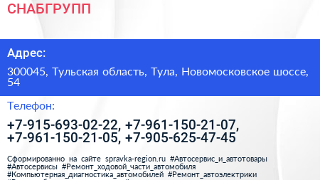 СНАБГРУПП по адресу 300045, Тульская область, Тула, Новомосковское шоссе, 54 в дальнейшем Организация, размещена в следующих категориях: