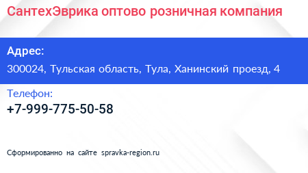 СантехЭврика, оптово-розничная компания по адресу 300024, Тульская область, Тула, Ханинский проезд, 4 в дальнейшем Организация, размещена в следующих категориях: