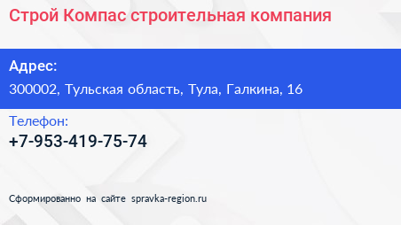 Строй Компас, строительная компания по адресу 300002, Тульская область, Тула, Галкина, 16 в дальнейшем Организация, размещена в следующих категориях: