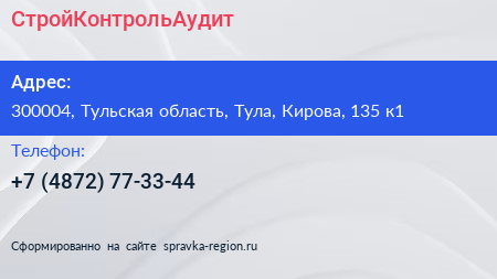СтройКонтрольАудит по адресу 300004, Тульская область, Тула, Кирова, 135 к1 в дальнейшем Организация, размещена в следующих категориях: