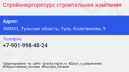 Стройэнергоресурс, строительная компания по адресу 300041, Тульская область, Тула, Колетвинова, 9 в дальнейшем Организация, размещена в следующих категориях: