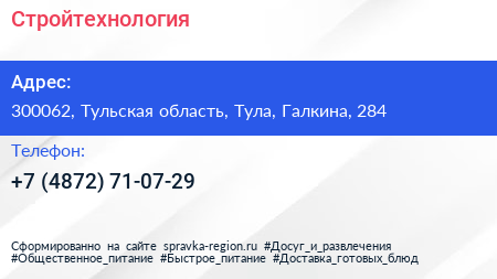 Стройтехнология по адресу 300062, Тульская область, Тула, Галкина, 284 в дальнейшем Организация, размещена в следующих категориях: