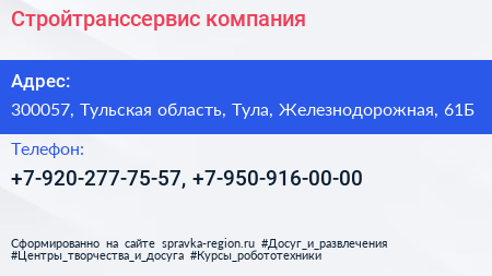 Стройтранссервис, компания по адресу 300057, Тульская область, Тула, Железнодорожная, 61Б в дальнейшем Организация, размещена в следующих категориях: