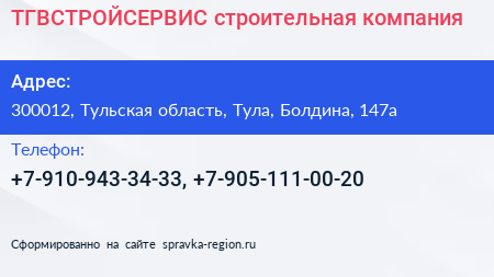 ТГВСТРОЙСЕРВИС, строительная компания по адресу 300012, Тульская область, Тула, Болдина, 147а в дальнейшем Организация, размещена в следующих категориях: