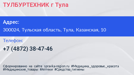 ТУЛБУРТЕХНИК, г. Тула по адресу 300024, Тульская область, Тула, Казанская, 10 в дальнейшем Организация, размещена в следующих категориях: