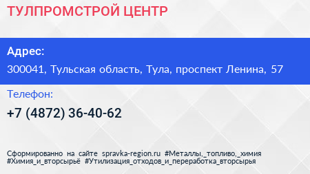 ТУЛПРОМСТРОЙ-ЦЕНТР по адресу 300041, Тульская область, Тула, проспект Ленина, 57 в дальнейшем Организация, размещена в следующих категориях: