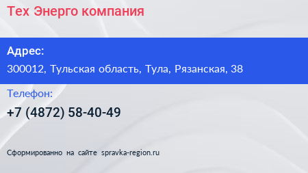Тех-Энерго, компания по адресу 300012, Тульская область, Тула, Рязанская, 38 в дальнейшем Организация, размещена в следующих категориях: