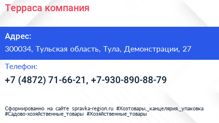 Терраса, компания по адресу 300034, Тульская область, Тула, Демонстрации, 27 в дальнейшем Организация, размещена в следующих категориях:
