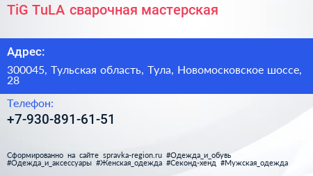 TiG TuLA, сварочная мастерская по адресу 300045, Тульская область, Тула, Новомосковское шоссе, 28 в дальнейшем Организация, размещена в следующих категориях: