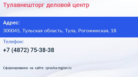 Тулавнешторг, деловой центр по адресу 300045, Тульская область, Тула, Рогожинская, 18 в дальнейшем Организация, размещена в следующих категориях: