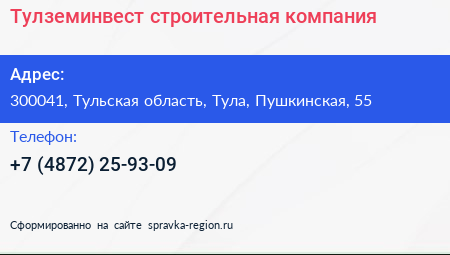 Тулземинвест, строительная компания по адресу 300041, Тульская область, Тула, Пушкинская, 55 в дальнейшем Организация, размещена в следующих категориях: