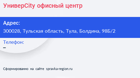 УниверCity, офисный центр по адресу 300028, Тульская область, Тула, Болдина, 98Б/2 в дальнейшем Организация, размещена в следующих категориях: