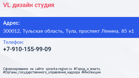 VL, дизайн-студия по адресу 300012, Тульская область, Тула, проспект Ленина, 85 к1 в дальнейшем Организация, размещена в следующих категориях: