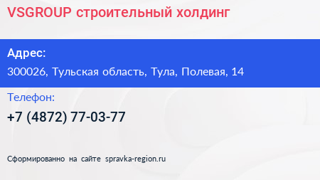 VSGROUP, строительный холдинг по адресу 300026, Тульская область, Тула, Полевая, 14 в дальнейшем Организация, размещена в следующих категориях:
