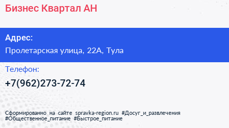Бизнес Квартал АН по адресу Пролетарская улица, 22А, Тула в дальнейшем Организация, размещена в следующих категориях: