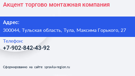 Акцент, торгово-монтажная компания по адресу 300044, Тульская область, Тула, Максима Горького, 27 в дальнейшем Организация, размещена в следующих категориях: