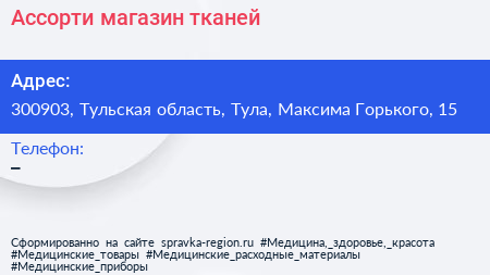 Ассорти, магазин тканей по адресу 300903, Тульская область, Тула, Максима Горького, 15 в дальнейшем Организация, размещена в следующих категориях:
