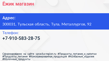 Ёжик, магазин по адресу 300031, Тульская область, Тула, Металлургов, 92 в дальнейшем Организация, размещена в следующих категориях: