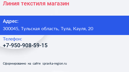 Линия текстиля, магазин по адресу 300045, Тульская область, Тула, Кауля, 20 в дальнейшем Организация, размещена в следующих категориях: