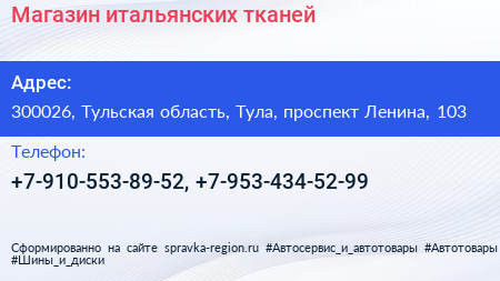 Магазин итальянских тканей по адресу 300026, Тульская область, Тула, проспект Ленина, 103 в дальнейшем Организация, размещена в следующих категориях: