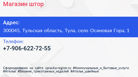 Магазин штор по адресу 300045, Тульская область, Тула, село Осиновая Гора, 1 в дальнейшем Организация, размещена в следующих категориях:
