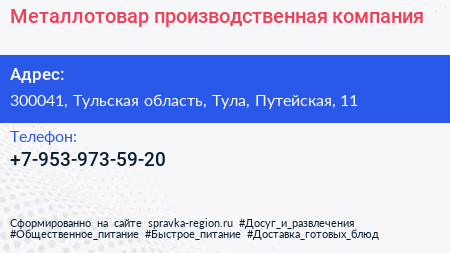 Металлотовар, производственная компания по адресу 300041, Тульская область, Тула, Путейская, 11 в дальнейшем Организация, размещена в следующих категориях: