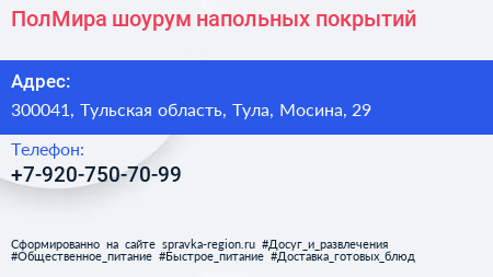 ПолМира, шоурум напольных покрытий по адресу 300041, Тульская область, Тула, Мосина, 29 в дальнейшем Организация, размещена в следующих категориях:
