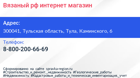Вязаный.рф, интернет-магазин по адресу 300041, Тульская область, Тула, Каминского, 6 в дальнейшем Организация, размещена в следующих категориях: