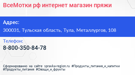 ВсеМотки.рф, интернет-магазин пряжи по адресу 300031, Тульская область, Тула, Металлургов, 108 в дальнейшем Организация, размещена в следующих категориях: