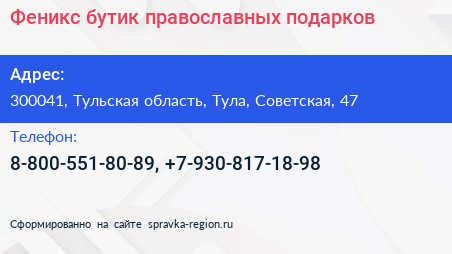 Феникс, бутик православных подарков по адресу 300041, Тульская область, Тула, Советская, 47 в дальнейшем Организация, размещена в следующих категориях: